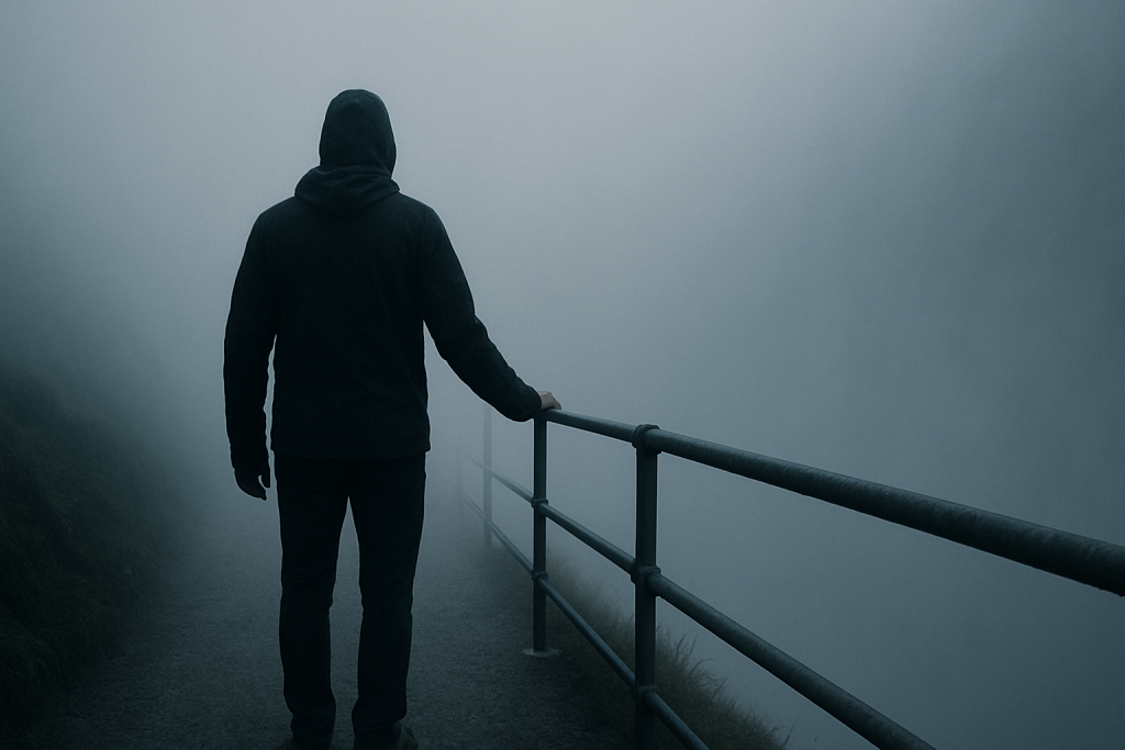 Ich suchte mit der Hand nach etwas Festem, irgendetwas, das mich an die Wirklichkeit band. Erst war da nur Luft. Dann spürte ich Metall – kalt, rau, verlässlich. Das Geländer. Ich war wieder nahe am Rand des Steilhangs. Ich musste im Kreis gegangen sein. Reiß dich zusammen, redete ich mir ein. Doch egal, was ich tat oder dachte: Ein Geräusch wie der Widerhall einer Stimme hinter mir blieb. Es war einfach da, wurde nicht lauter, nicht leiser. Fast war es, als würde es auf den richtigen Moment warten. Ich redete mir ein, es seien Schritte. Doch mit jedem Atemzug passte das Geräusch weniger zu etwas außerhalb von mir. Es klang wie ein Echo, das zu spät zurückkam.